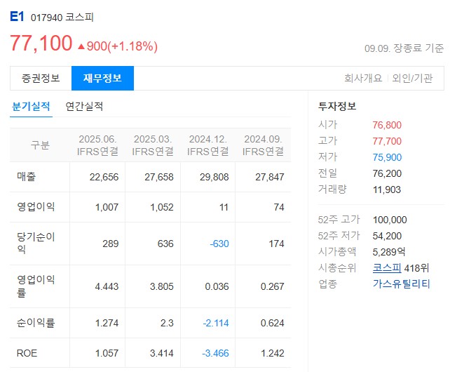 1. 2025년 E1 실적 분석 하반기 '턴어라운드' 가능성