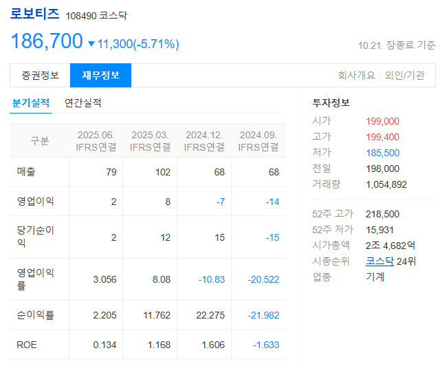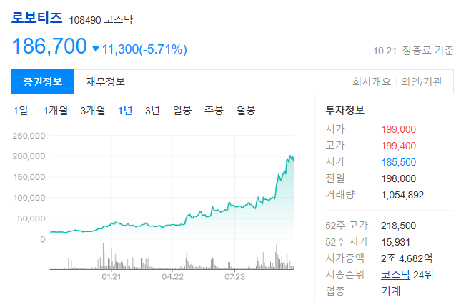 2025년 10월 21일 기준, 대한민국 로봇 섹터에서 가장 뜨거운 종목을 꼽으라면 단연 로보티즈(108490)일 것입니다. 연초 대비 600%가 넘는 경이적인 주가 상승률을 기록하며, 전일(10월 20일) 종가 198,000원을 기록했습니다.