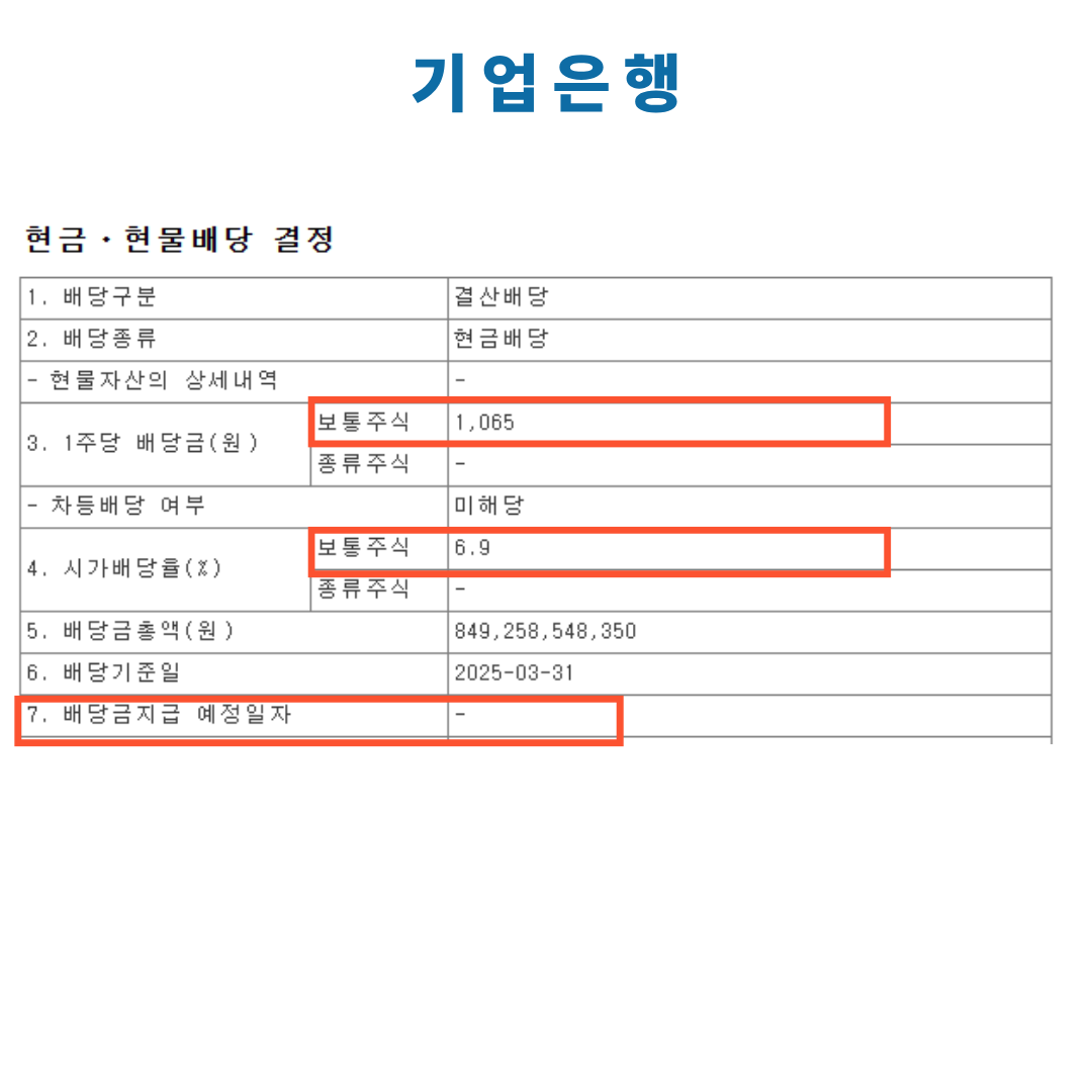 우선 지난 배당 내역을 복기해 보겠습니다. 기업은행은 2024년 결산 배당으로 주당 1,065원의 현금 배당을 결정했으며, 이는 2025년 3월 말 배당기준일 주주들에게 지급 완료되었습니다. 당시 배당 성향은 약 35% 수준으로, 주주환원 의지를 명확히 보여주었습니다.
