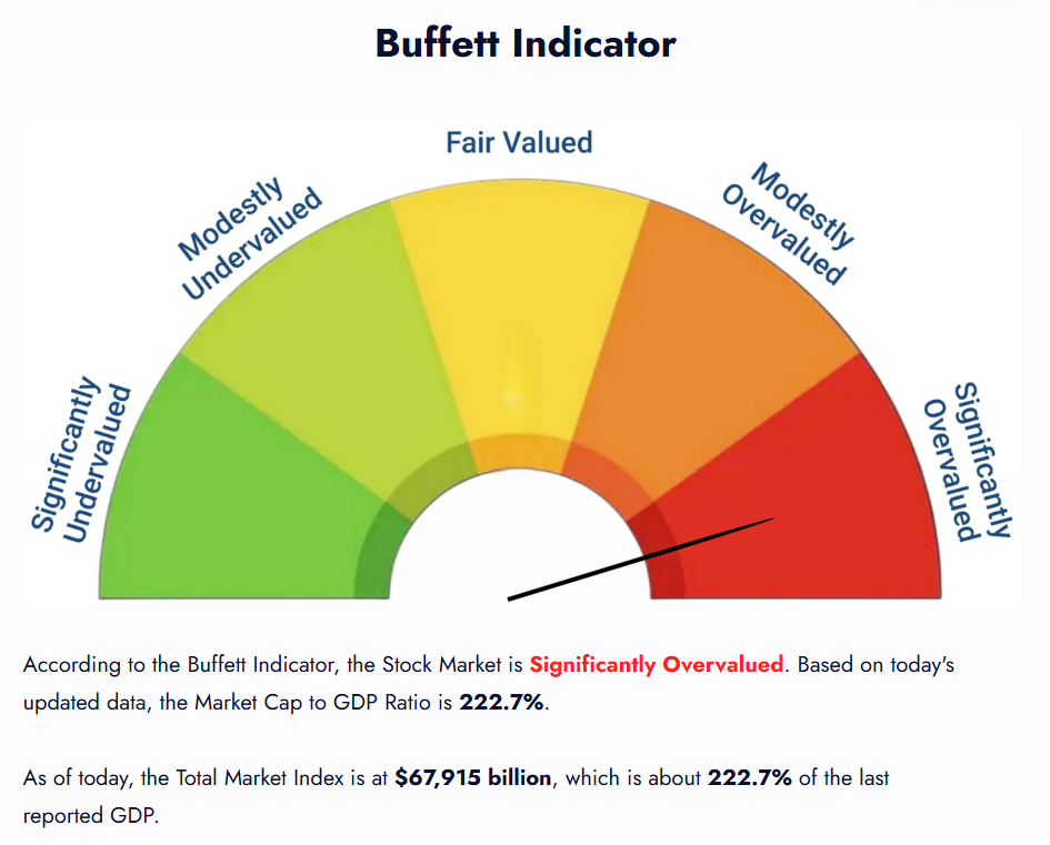 데이터 시점 기준으로 현재 미국 증시의 버핏지수는 222.7%까지 오르고 있습니다. 이는 워런 버핏의 '고평가' 기준선인 120%를 아득히 넘어선 수치입니다.