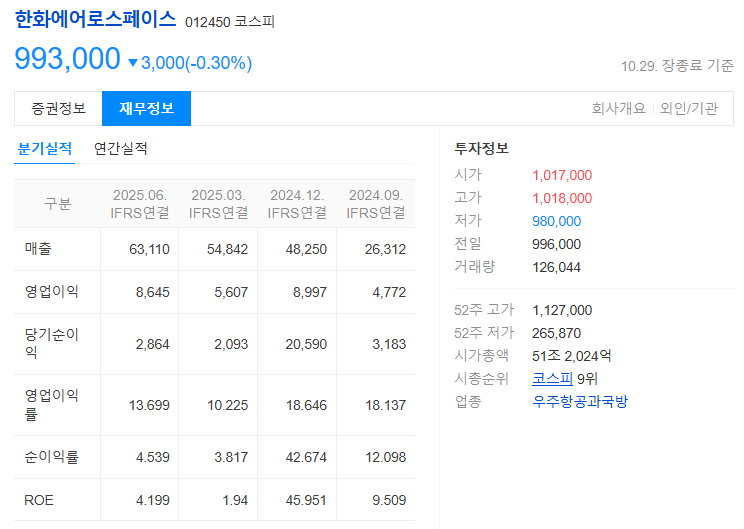 K-방산의 역사를 새로 쓰고 있는 한화에어로스페이스(012450). 2025년 10월 29일(수) 시장은 993,000원으로 마감하며 숨 고르기에 들어간 모습입니다.