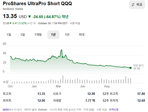 어제(2025년 10월 30일)만 해도 SQQQ는 하루 만에 +4.62% 급등하며 $13.35에 마감했습니다. 이는 반대로 나스닥 100 지수가 그만큼 고통스러운 하락을 경험했다는 뜻입니다. 52주 최저가($12.68) 근방이던 주가가 꿈틀대자, '지금이 하락 베팅의 적기인가?'라며 고민하는 분들이 많아졌습니다.