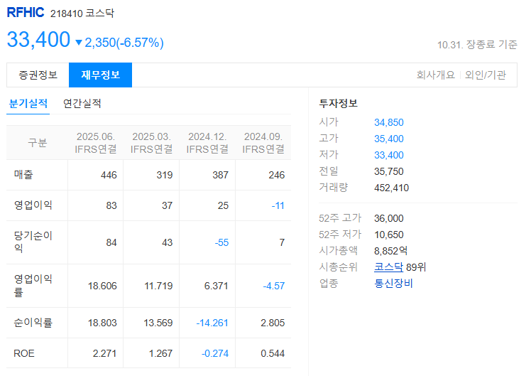 ▶ RFHIC (218410) 현재 주가 및 기업 개요
