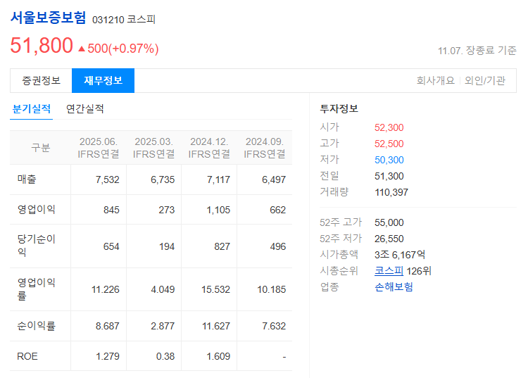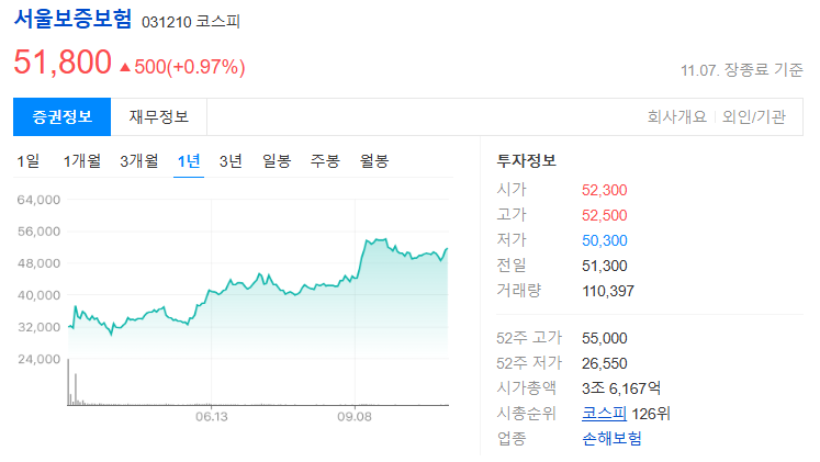 서울보증보험(031210) 종가: 51,800원 (전일 대비 +500원, +0.97% 상승 마감)